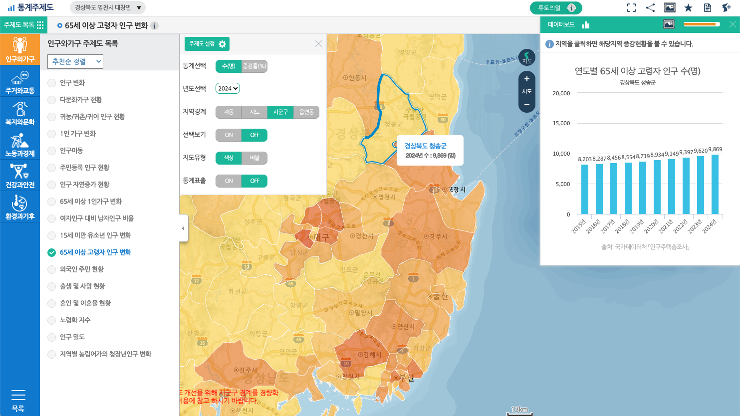 | SGIS (통계지리정보서비스) | 인구, 산업, 복지 등 180개 지표를 지도로 제공 | 청송군의 고령화율, 1인 가구 비율 확인 |